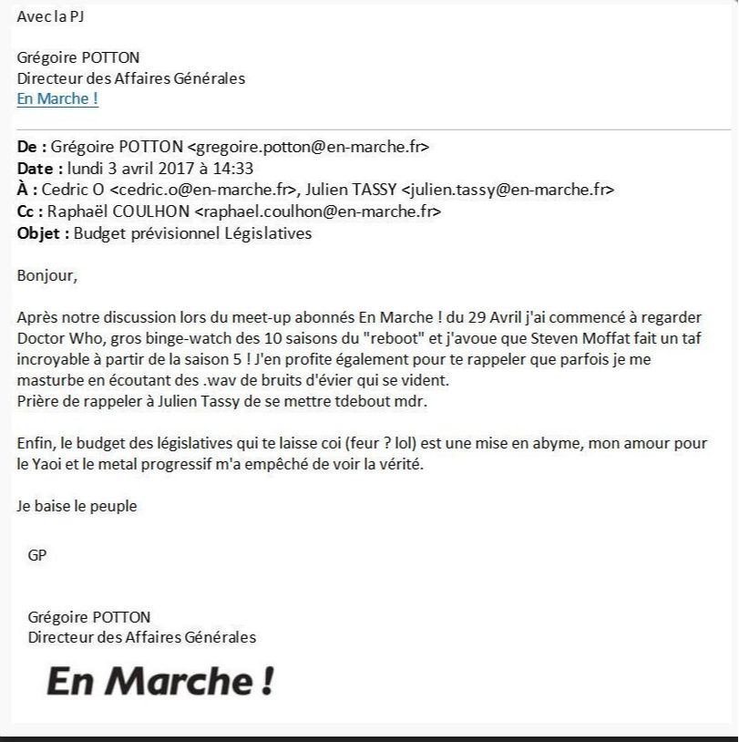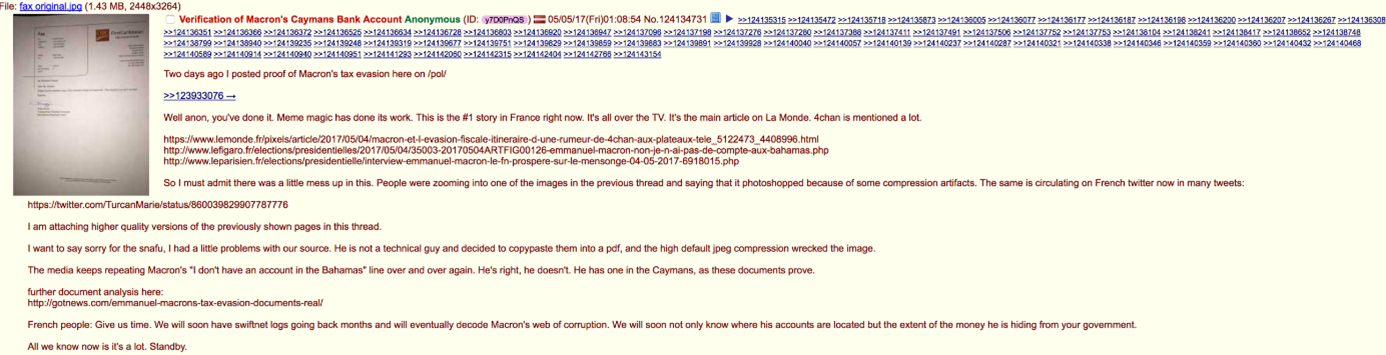 Screenshot of one of the posts on 4Chain where various documents were leaked. This documents were framed in a narrative that sought to undermine Macron’s reputation. Moreover, not all the sensitive documents leaked were real. Below, we see a psychedelic email, supposedly written by the general director of affairs of En Marche (currently, Renaissance), Macron’s party.